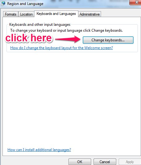 Next, you should see the Keyboards and Languages tab under Region and Language. Here, click on Change keyboards.